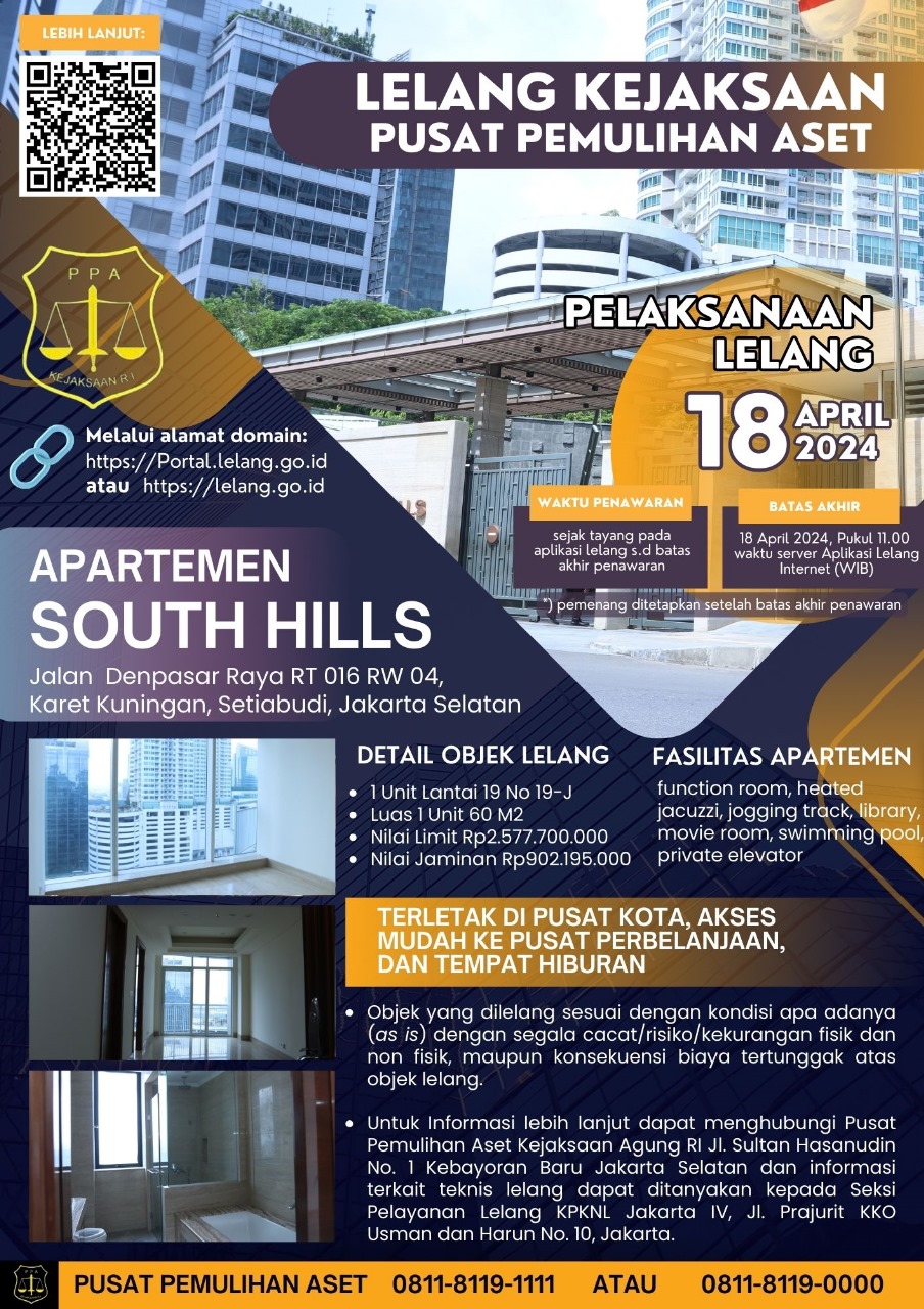 Jakarta, Muaramars.com — Badan Pemulihan Aset Kejaksaan Agung akan melaksanakan kegiatan aanwijzing (penjelasan lelang) serta show unit atas barang rampasan berupa 4 (empat) unit apartemen pada Kamis 4 April 2024, yakni:  2 (dua) unit Apartemen Raffles lantai 36/D dan 43/A berlokasi di Jl. Prof. Dr. Satrio Kav No.3 dan 5, Kelurahan Karet, Kecamatan Setiabudi, Kota Jakarta Selatan, DKI Jakarta, yang akan dilaksanakan pada pukul 10.00 s/d 11.00 WIB;