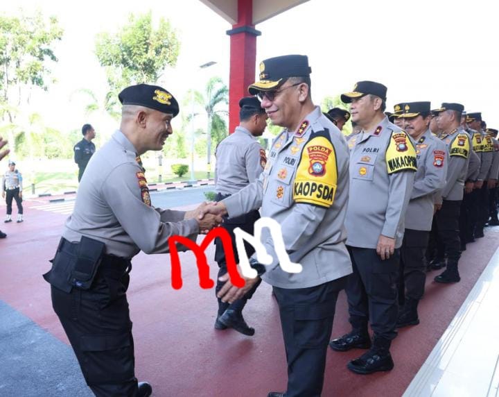 Kapolda Kepri Irjen Pol Drs Yan Fitri Halimansyah MH didampingi Wakapolda Kepri Brigjen Pol Asep Safrudin SIK MH, Karolog Polda Kepri Brigjen Pol Jakub Prajogo SIK MSi, Irwasda Polda Kepri Kombes Pol Sri Satyatama SIK MH MM MHan bersalam-salam dengan seluruh personel Polda Kepri  Ucapkan Selamat Idul Fitri 1445 H pada momen halal bihalal, Selasa (16/4/2024).