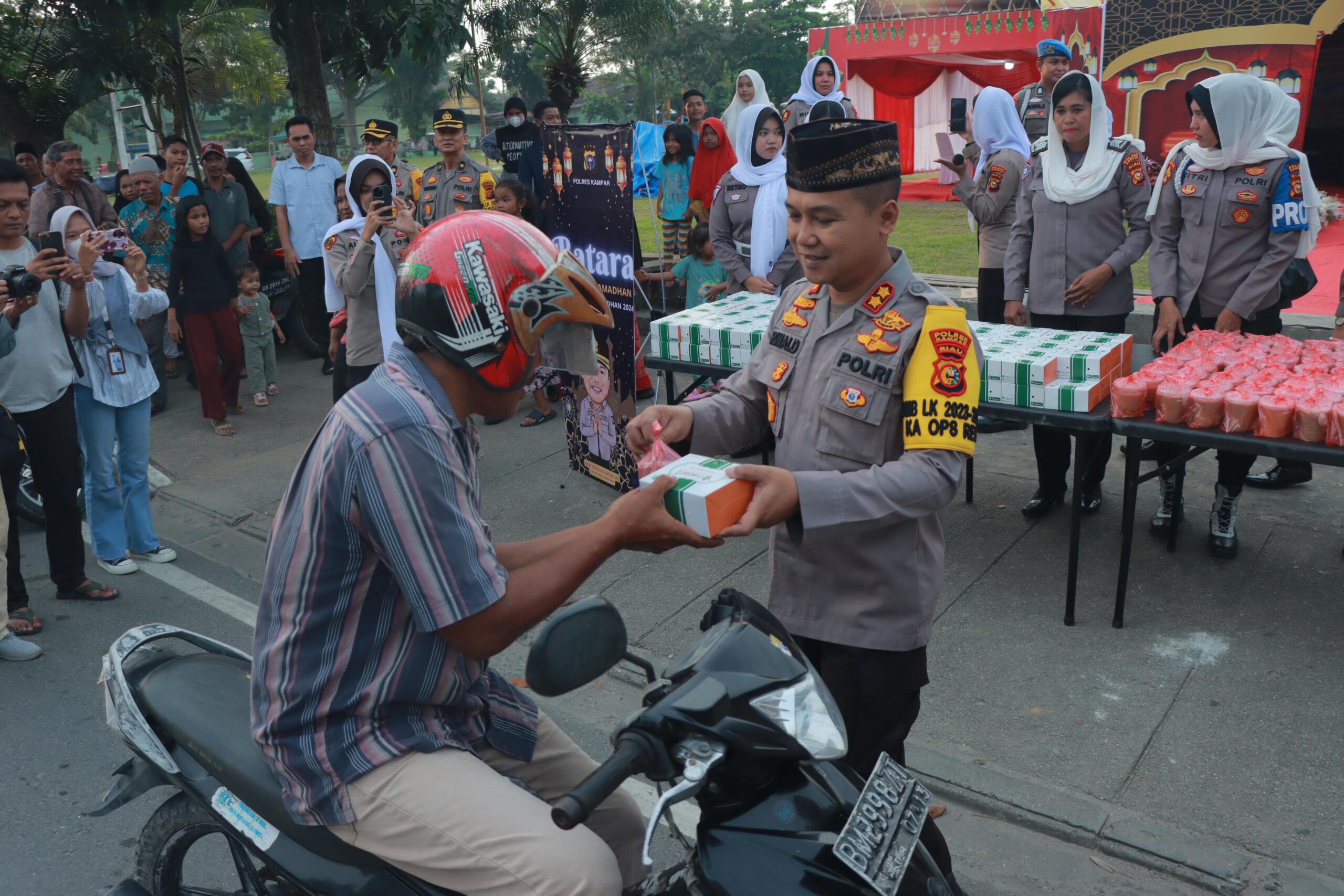 Kapolres Kampar bersama beberapa Pejabat Utama Polres serta Srikandi Polres Kampar yang hadir dalam kegiatan ini, membagikan takjil secara langsung kepada masyarakat.